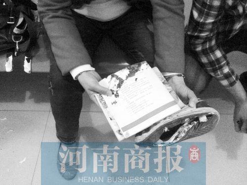 河南商报记者 段睿超孩子的母亲手里拿着沾有儿子血迹的课本和被车子压烂的鞋子